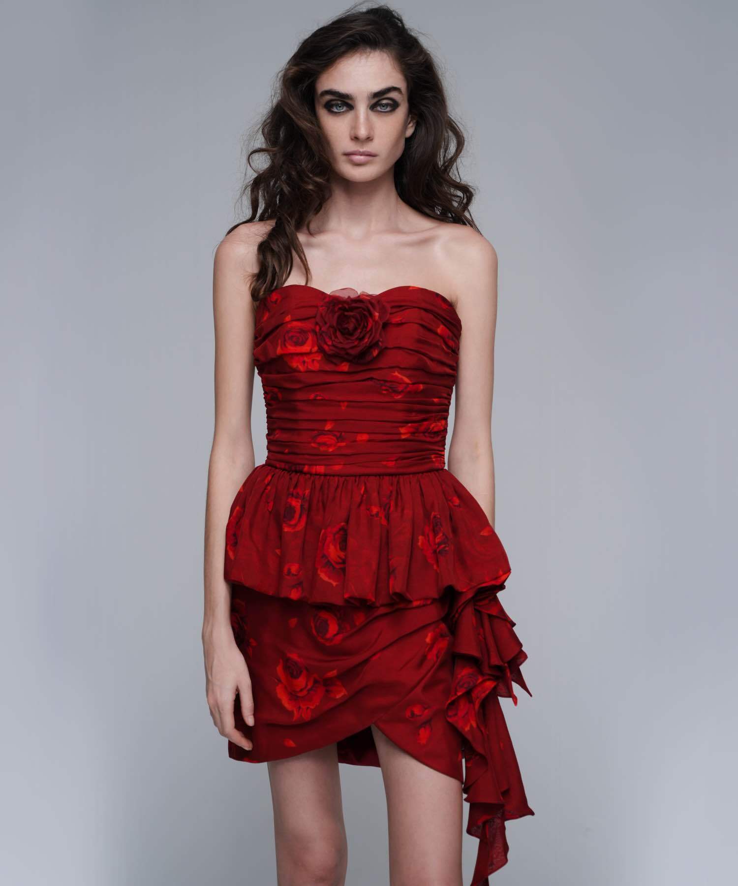 Loreen, юбка мини из бордового шифона с крупными красными цветами